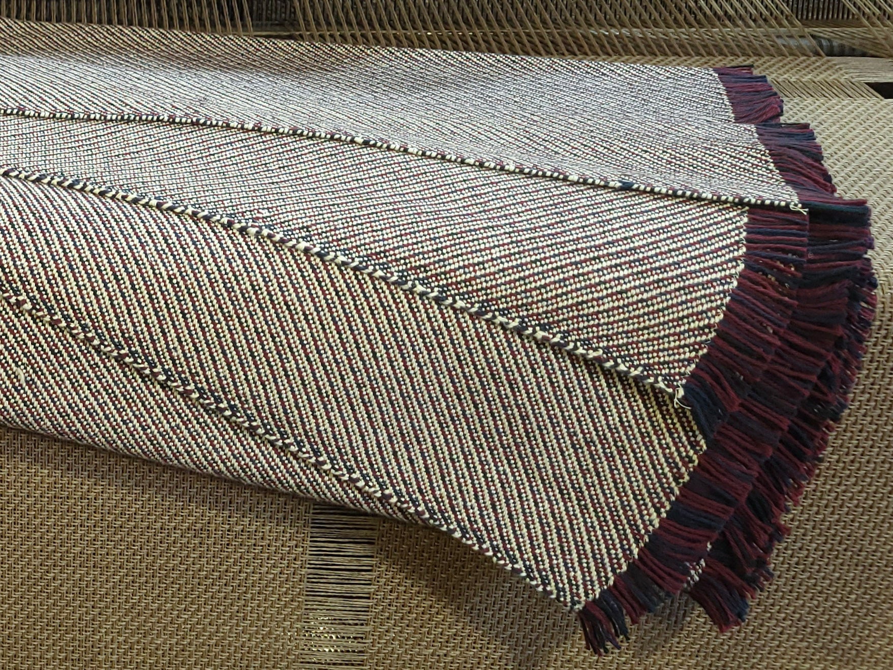 Featuring hand cut fringe along one edge, flat selvedge edge along the other.