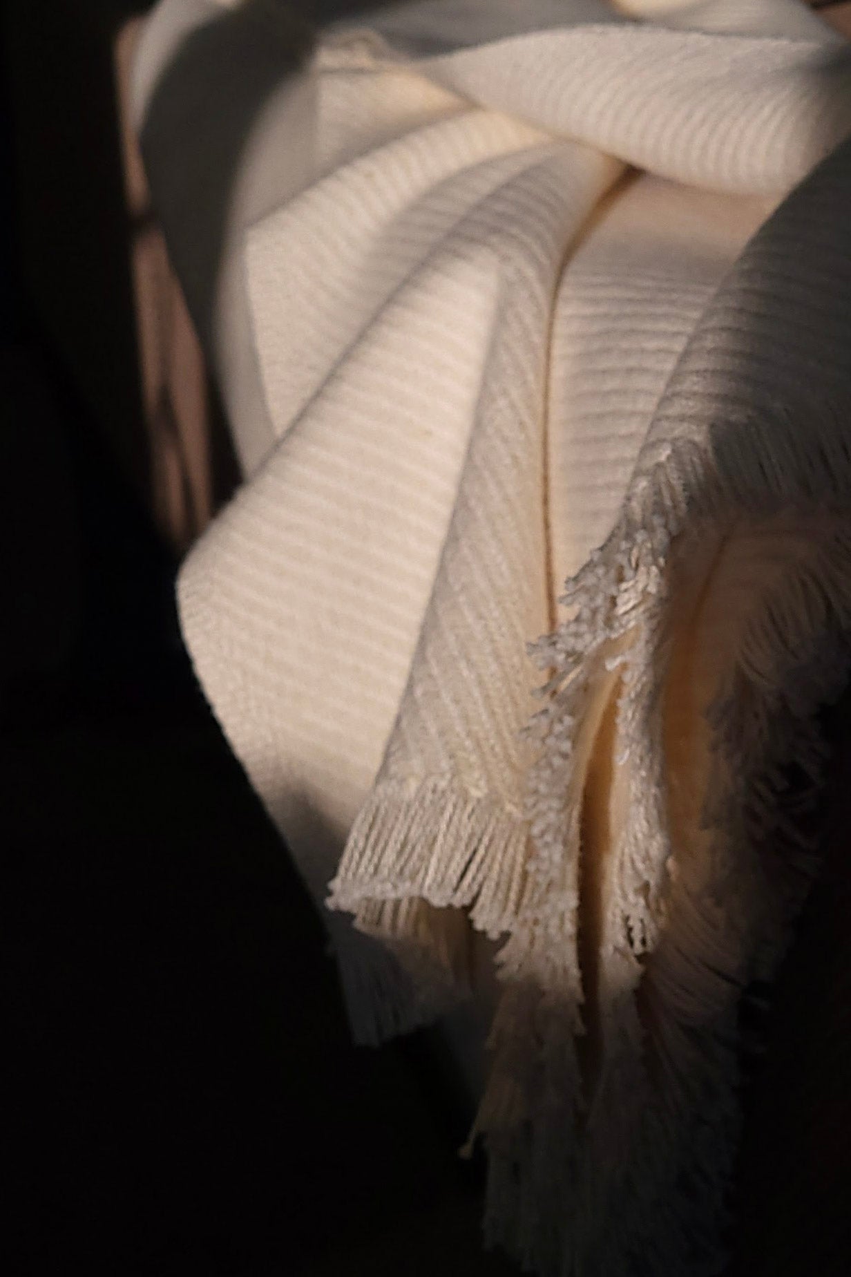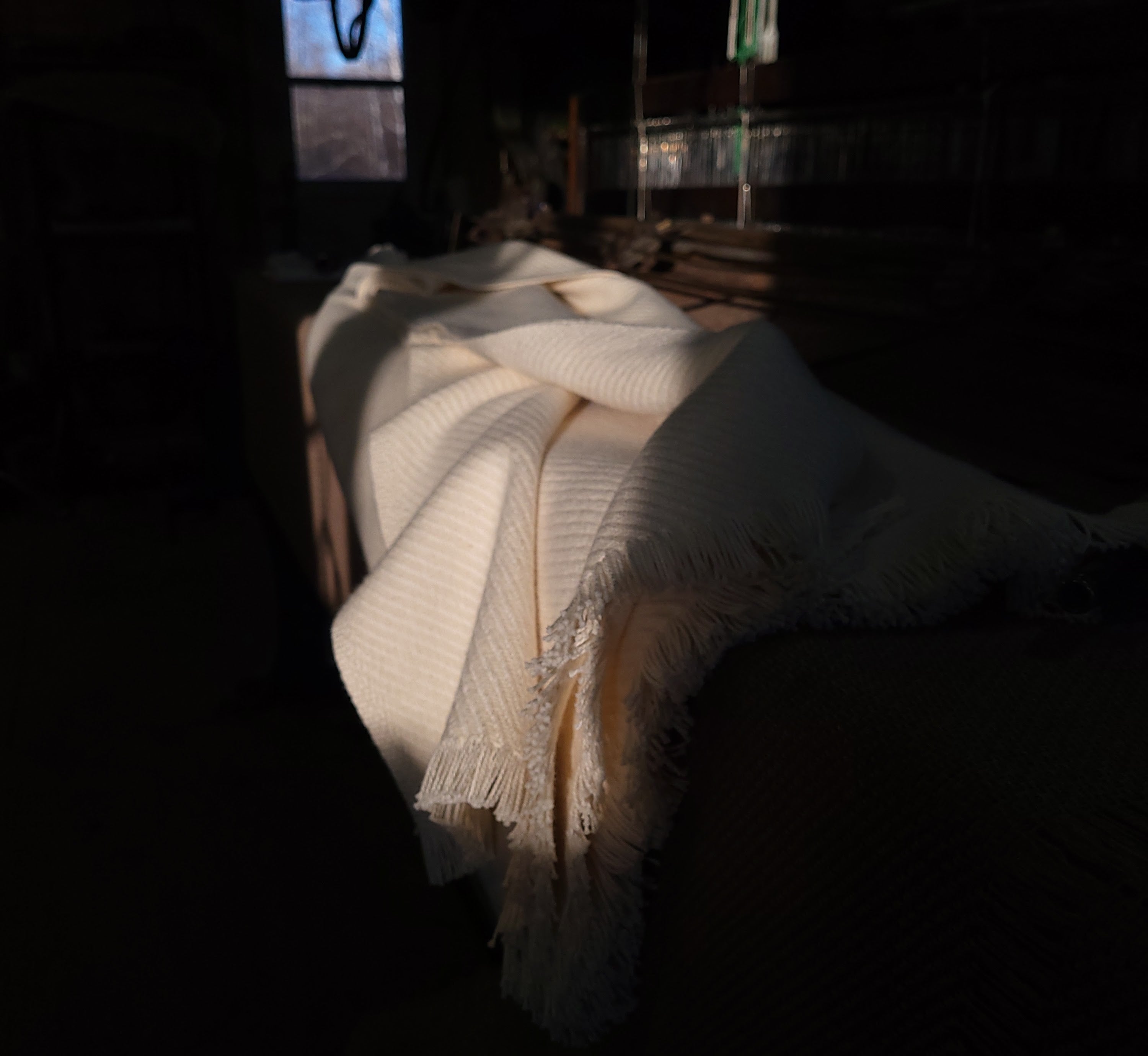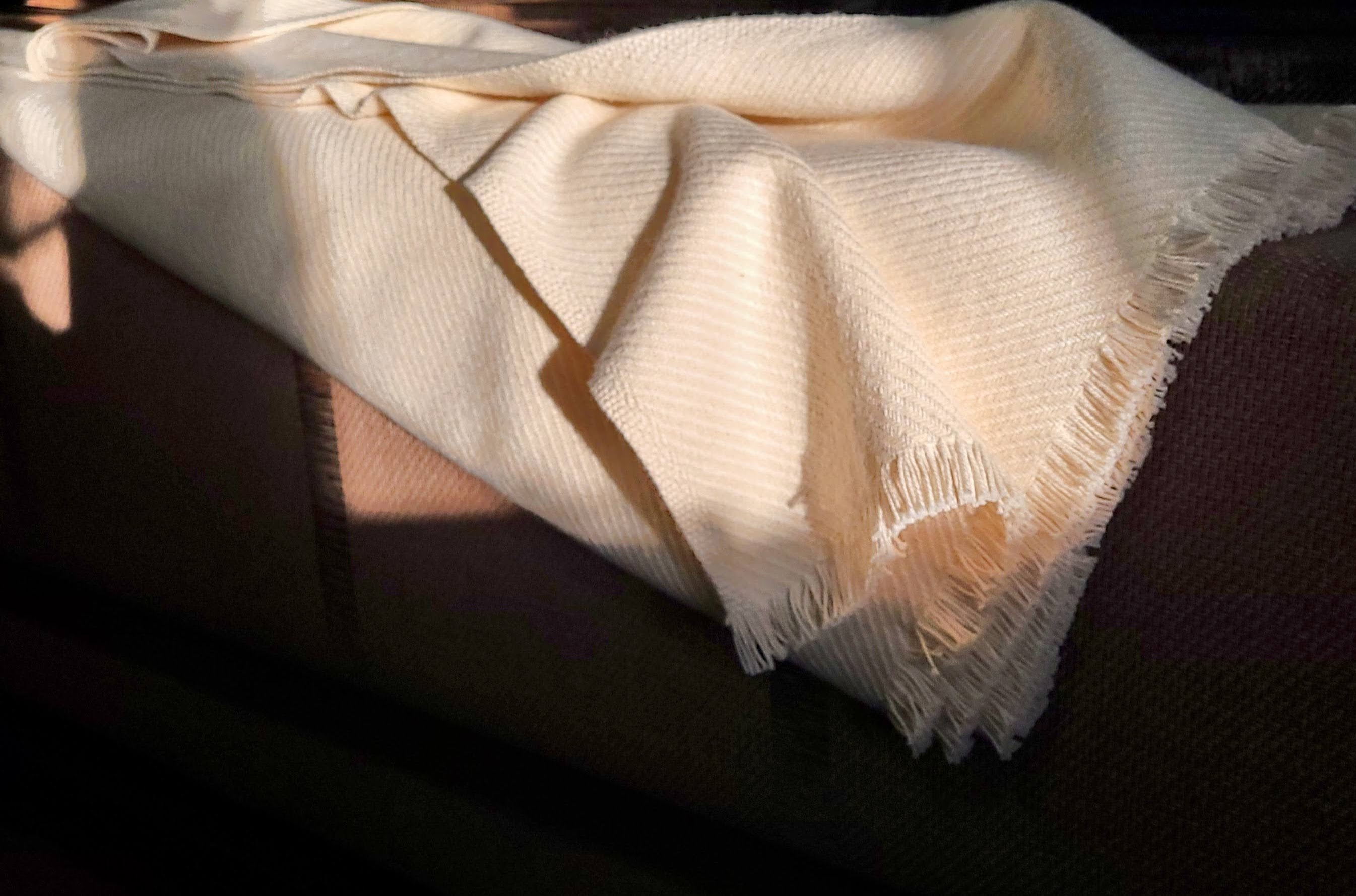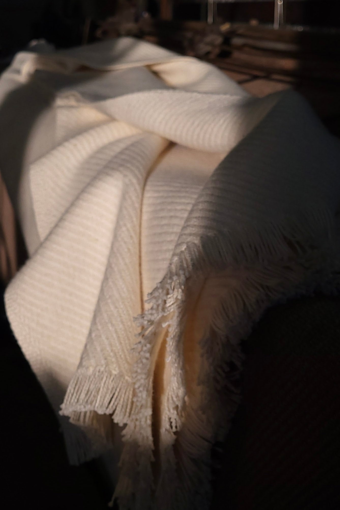 This blanket is woven from a natural ringspun cotton warp and undyed lambswool weft threads.  It is a lovely natural white shade with a very nice handle.